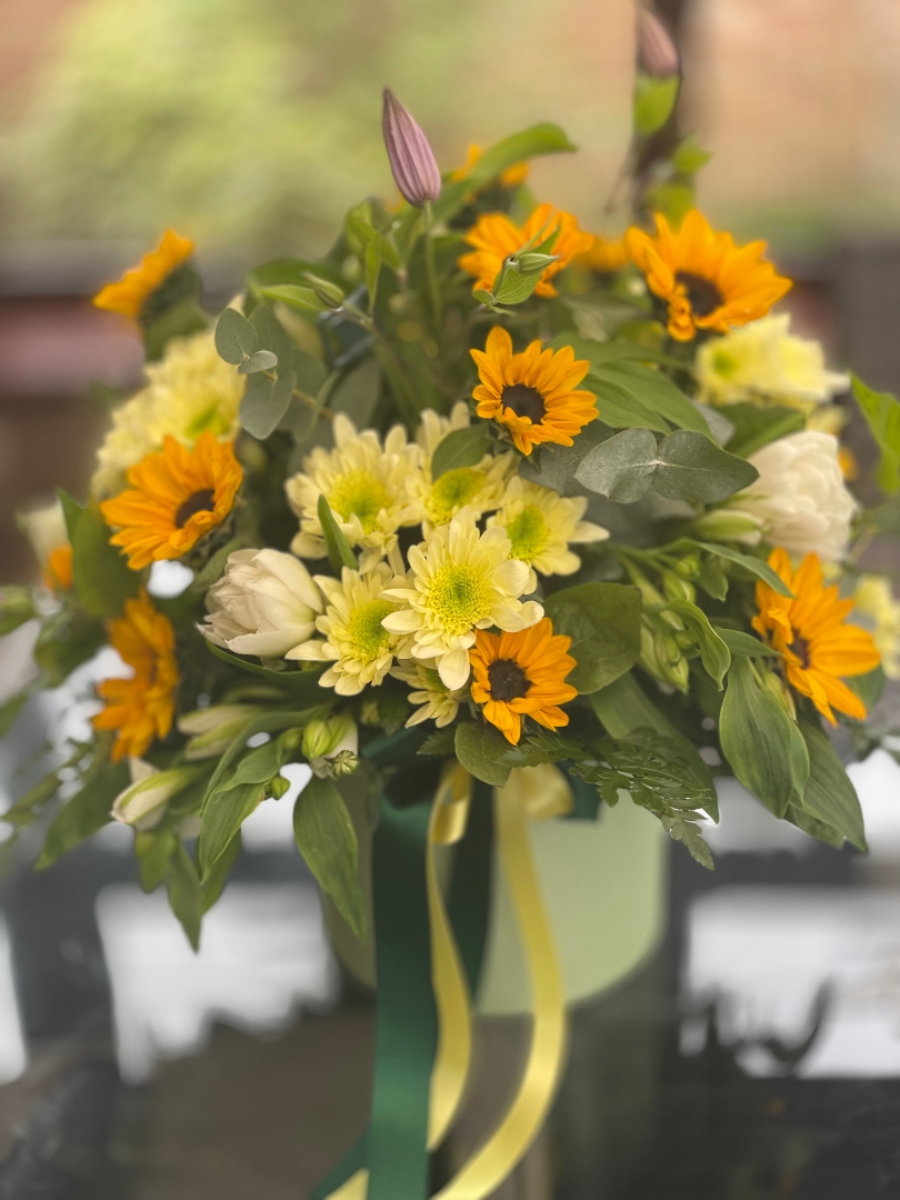 Order Now and bring a ray of sunshine into someone’s life with this beautiful Sunflower Hat Box Arrangement.A charming arrangement of seasonal flowers and foliage, featuring delightful mini sunflowers—ideal for anyone who adores sunflower bouquets. Perfect for celebrating the special moments in their lives.