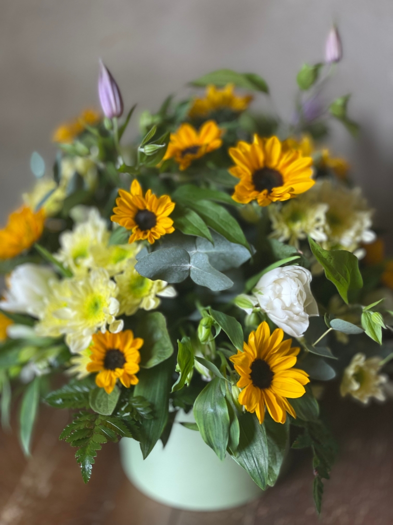 • Main Flowers: Mini sunflowers, symbolising warmth and happiness, are the stars of this arrangement.